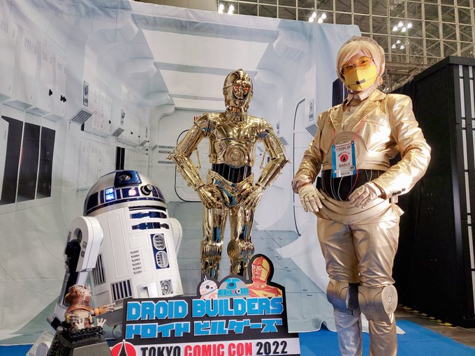 昨日26日のコミコンの思い出1 会場入口入ってすぐのドロイドビルダーズさんのあーぴお撮影スポットでパシャリ📸 推しドロイド2人とならんでC-3POコスで写真撮影できたの最高すぎる😍 #東京コミコン2022 #東京コミコンコスプレ #StarWars