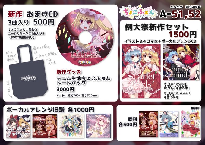 名華祭のお品書き完成版です。新刊は兎と氷削り物語を配布します。チュロさんとかなおさんがゲスト参戦します(作品も有ります)。 B47.48幻想大膳寮にお越し下さい。 イベント詳細:meikasai.com #東方名華祭