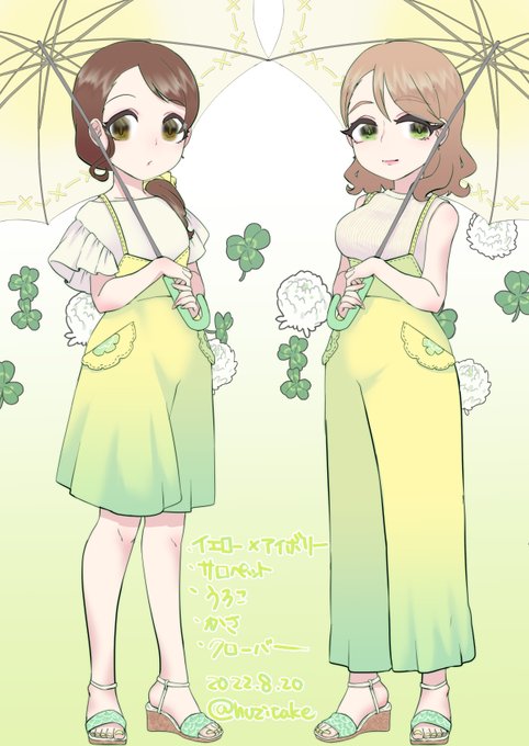 きよありさんに以下の衣装を仕立ててください 基調色:イエロー×アイボリー テイスト:サロペット モチーフ等:鱗、傘、クローバー #shindanmaker shindanmaker.com/1134954 双子コーデだいすきマン。 #柳清良 #持田亜里沙