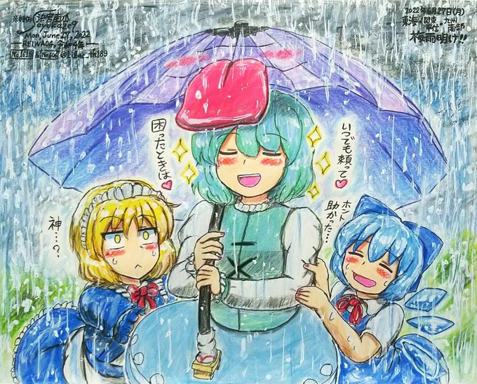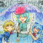 梅雨明けで小傘ちゃんの季節は終わり? いえいえ、そんなことは☔️☔️ +9分 (1時間9分) #チルノ #多々良小傘 #深夜の真剣お絵描き60分一本勝負 (東方版・1615回目参加) #夢月 #東方版もうひとつの深夜の真剣お絵描き60分一本勝負 (もうひとつ版・606回目参加) (※12月15日お題) #梅雨明け #ゲリラ豪雨
