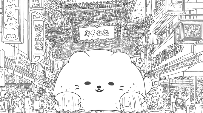 「横浜中華街を破壊する猫」の線画バージョン。 いつになったら終わるんだろうと 思いながら描いていました #イラスト好きさんと繋がりたい #絵描きさんとつながりたい #誰かの推し作家になりたい #イラスト #みんなで楽しむTwitter展覧会 #破壊する猫 #猫 #横浜中華街