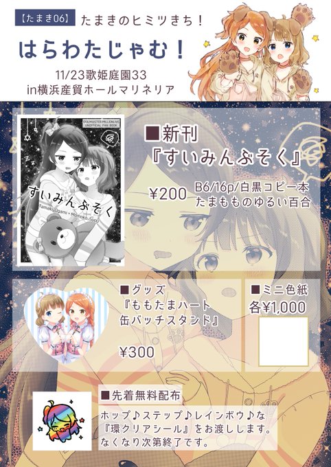 【お品書き】 来る11/23(水・祝)に横浜産貿ホールマリネリアで開催されるアイマスオンリー同人イベント・「歌姫庭園33」に、出ます。 弊サークル「どせいのわっか」では、イラスト本を1冊頒布いたします。 この表紙の通りの内容です 当日、夢のステージで逢おうゼ… #歌姫庭園33 #たまきのヒミツきち