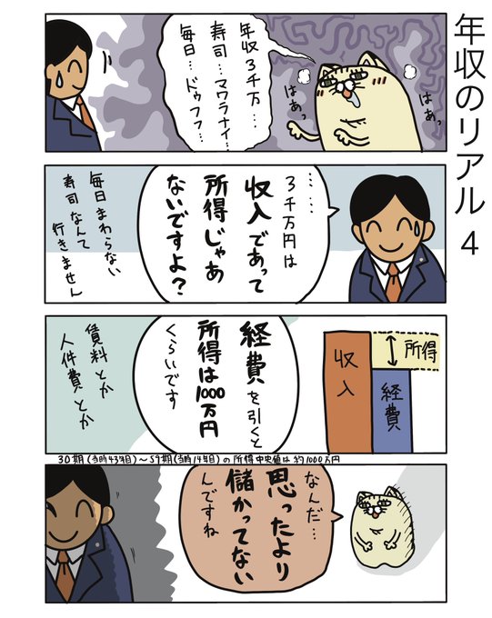 実態の把握って難しいですよね 世間一般でいう「年収」と、弁護士の「所得」も感覚的にちょっとズレてる気がしますし #弁護士 #法律事務所 #漫画 #四コマ漫画 #エッセイ漫画 #漫画が読めるハッシュタグ #マンガが読めるハッシュタグ #たぬじろう #食っていけない弁護士