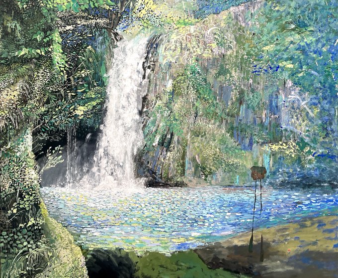 「想廻の滝」 A4 アクリルガッシュ・水彩色鉛筆 想いは星になって 光り流れ廻り また光照らしますように #イラスト #Illustration #art #滝 #waterfall #芸術の輪 #ArtOnTwitter #みんなで楽しむTwitter展覧会