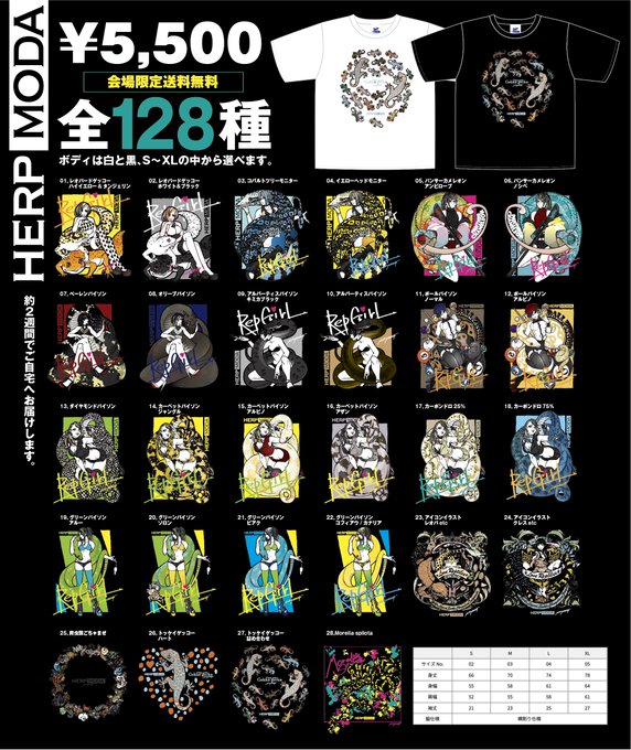 7/2-3日限定販売!! レプタイルズフィーバー当日に今まで描いた爬虫類イラストほぼ全てを選べるTシャツを受注します! ビッグシルエットで全128種、白と黒から選べます。 会場での注文は送料無料でお届けします。 7月19日頃のお届けになる予定です。 #herpmoda #レプタイルズフィーバー #爬虫類