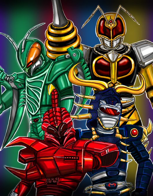 ビークラッシャー四鎧将 🟥猛毒鎧将 デスコーピオン 🟦冷血鎧将 ムカデリンガー 🟩魔剣鎧将 キルマンティス 🟨変幻鎧将 ビーザック 特撮トークで盛り上がり描かせていただきました☺️ 昆虫と戦闘装備の融合デザインがカッコいい‼️勉強になりました😌 #ビーファイターカブト #特撮好きと繋がりたい