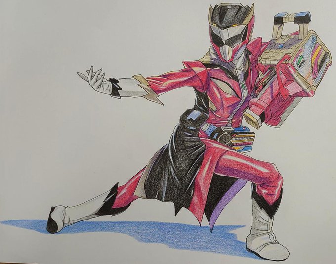 #オリジナルヒーロー #創作クラスタさんと繋がりたい #絵描きさん交流会 #鉄道 #特撮 #絵柄が好みって人がいたらいいなぁ #イラスト オリジナルヒーロー[神速戦隊ゴーライナーズ]より レッドライナー/グランドフォーム 変身ベルトのレッシャースキャナーでライナーズ(幻影)を召喚!