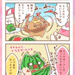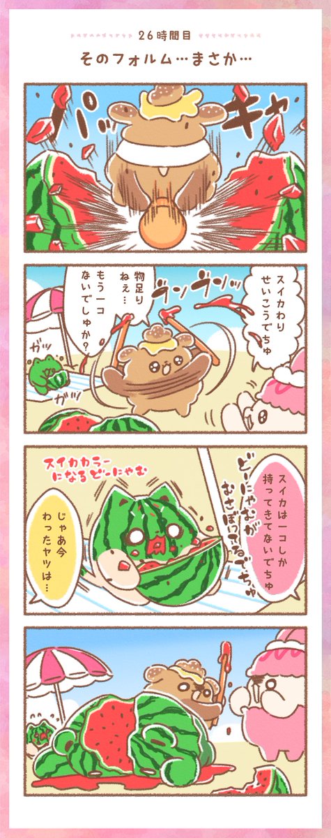 26時間目「そのフォルム…まさか…」 スイカくってスイカになるとは…どういうことなんだ… #甘ったれあにまるず🍩 #4コマ漫画 #漫画が読めるハッシュタグ #イラスト好きな人と繋がりたい