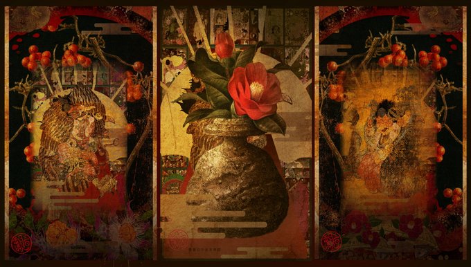 おはようございます。 今日も楽しい一日になりますように☺ ・ ミず鬼ずム団 feat.ほだか 妖華衣【椿】吉祥図‼ #初夏の創作クラスタフォロー祭り #いいねかRTで気になった人フォローする #ツイッターで楽しむ展覧会 #フォロー #拡散希望 #芸術の輪 #芸術同盟 #相互フォロー #油絵 #洋画 #画廊
