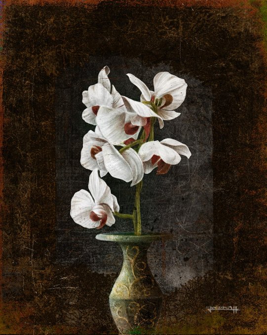 ミず鬼ずム団 ほだか作 「胡蝶蘭」 花言葉は「清純」「幸運が飛んでくる」 (白は「純粋」だそうです☺) #初夏の創作クラスタフォロー祭り #いいねかRTで気になった人フォローする #ツイッターで楽しむ展覧会 #フォロー #拡散希望 #芸術の輪 #芸術同盟 #相互フォロー #油絵 #洋画 #月刊美術 #画廊