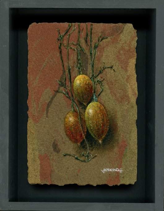 ミず鬼ずム団 ほだか作 陶板画(4点) ※陶板の上に描いた油絵 明日も良い一日になりますように☺ #いいねかRTで気になった人フォローする #人外が好きな一次創作者フォロー祭 #拡散希望 #画廊 #秋の創作クラスタフォロー祭り #芸術の輪 #芸術同盟 #絵描きさんと繋がりたい #油彩画 #静物