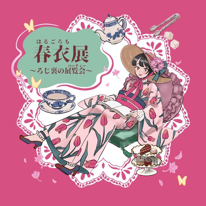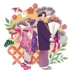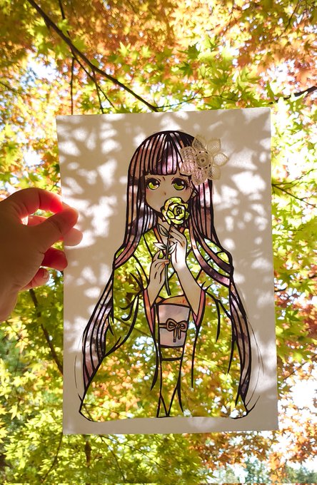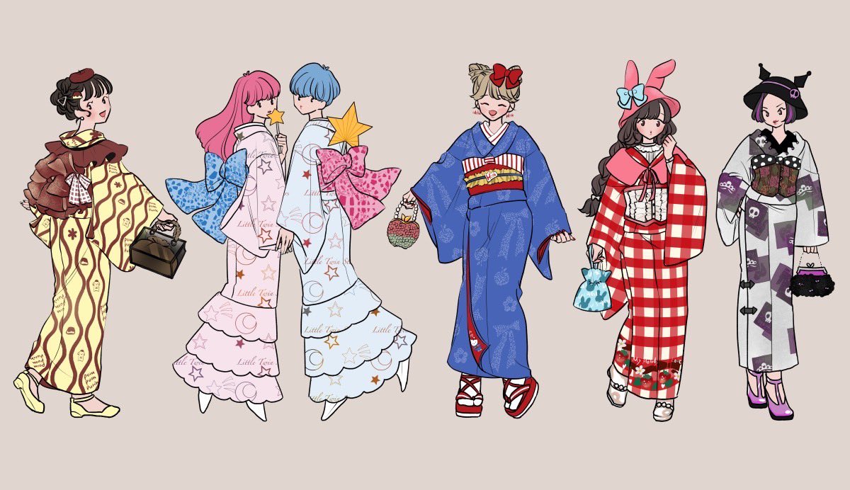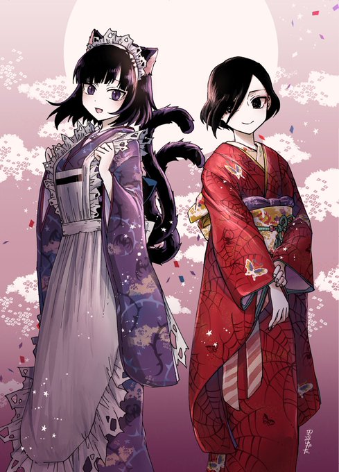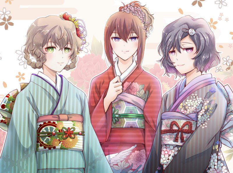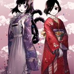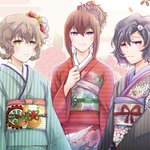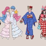 【甘味処 日和屋の看板娘たち】 🐱小鈴(左上) 🌸桜子(左下) 🍀緑子(右下) 額装ver.も載せてみました✨ #獣耳カフェの甘い誘惑 #コピック (今日11/15は #着物の日 だそうですね!✨色違いのお揃い着物もぜひご覧下さい💕)