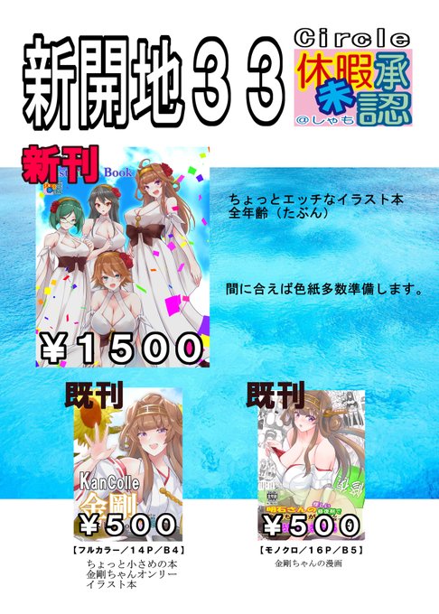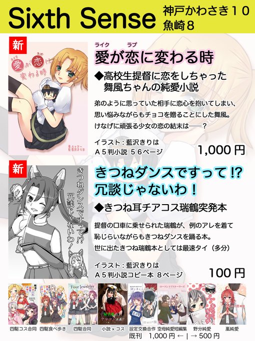 神戸かわさきお品書きです💎✨装う艦娘イラスト本と大井鹿島/香取鹿島/翔加賀/赤瑞を置いています🙏 布引14にて宜しくお願い致します! 本文サンプルはこちら→ min.togetter.com/5hdEw83 #神戸かわさき10 #230604薄花お知らせ (神戸かわさき)