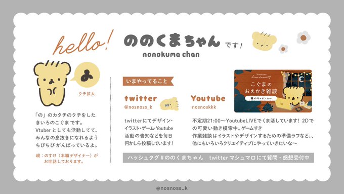 #私のくまを見て展 thanks to @info_nounours くまが好きすぎて くまになってYoutubeしてます📺 LIVE配信やお絵かき雑談 イラスト•グッズデザインなど いろいろ くま活たのしんでるよ🧸 BOOTH🧺nnkm.booth.pm Youtube📺youtube.com/user/nosnoskkk きいろいこぐまに いやされにきてね .ᐟ
