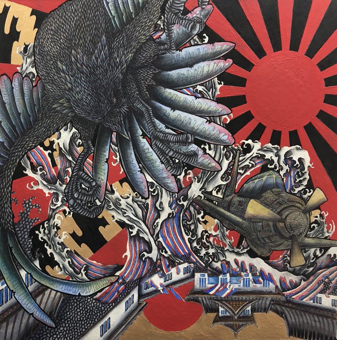完成しました🎌✨✨ 八咫烏と戦闘機、これからの時代を人を護りの道を照らす日の光であって欲しいという願いを込めました。 #絵柄が好みって人にフォローされたい #絵描きさんと繋がりたい #拡散希望RTお願いします #私を布教して