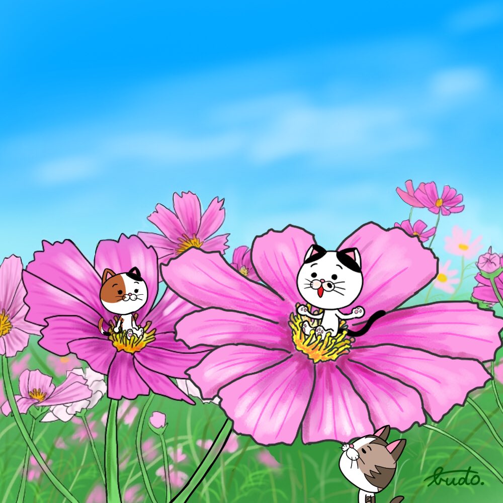 🐱 台風が去ってから、一気に秋っぽくなりました🌸😳 涼しくなったし…しっかり運動して、お腹をシュッとさせようと思います(笑)🤣💦 #イラスト #illustration #絵本 #猫好きさんと繋がりたい #ねこ #コスモス #秋桜 #お腹痩せ