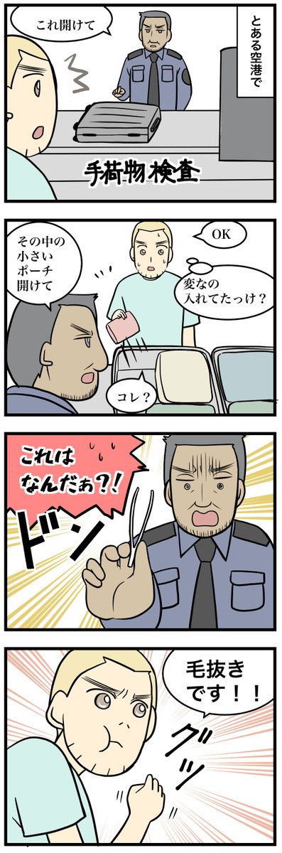 「空港の手荷物検査で没収されたもの」 高級毛抜き、匠の技がーーーーーー!!!! ブログの補足も見てね hikasango.com/archives/10949… #漫画 #漫画が読めるハッシュタグ #コミックエッセイ #絵日記 #4コマ漫画 #絵描きさんと繫がりたい #毛抜き #手荷物検査 #空港