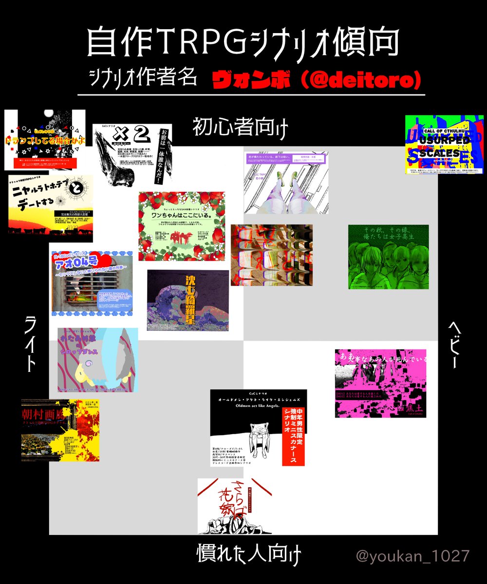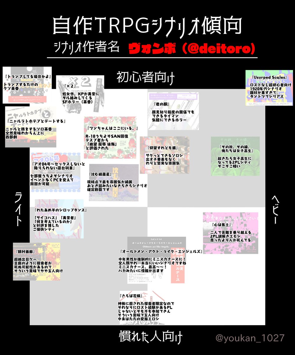 ボシでやったから見て~ 全部ホラーなので「雰囲気が軽いか重いか」でライト/ヘビー判定してます ▼BOOTH gumgumvon.booth.pm #自作TRPGシナリオ傾向 #ボトゥルフシナリオ