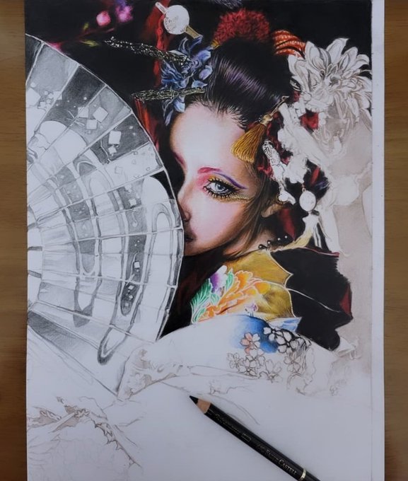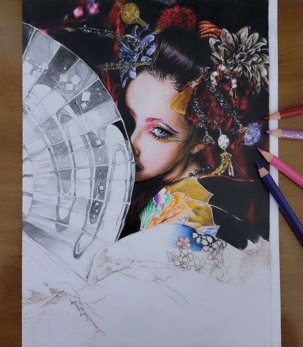 おはようございます🌞 とりあえず花魁のスミ入れは完了🥹❤️ 髪はYouTubeで見たペン画のテクニック使ったらめちゃくちゃ良くなった🥺❤️ さて、今から寝ます🥹 おやすみなさい😴💤 #illustration #artwork #花魁
