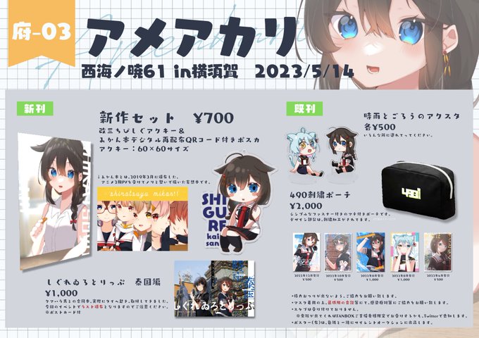 5/14㈰ 西海ノ暁61in横須賀 おしながきです!新しいものが色々あります~長門のアクキーは全種揃ってますが在庫かなり少ないので欲しいものがある方はお早めに🙋♀️ 等身大ながむつパネルも展示していただく予定です! 呉・横須賀ハシゴ企画についてはこちら→bbmm145.fanbox.cc/posts/5858242 #西海ノ暁
