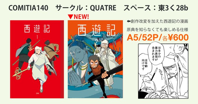 【コミティア140】明日のおしながきと通販のURLです。新刊は #西遊記 、既刊は擬人化創作の #ワンモタ があります。実質全巻揃うラインナップ。 画像にはとてもだいじなことたちが書いてあります。 全作全年齢向け。#コミティア140 #COMITIA140 ecs.toranoana.jp/tora/ec/item/0…