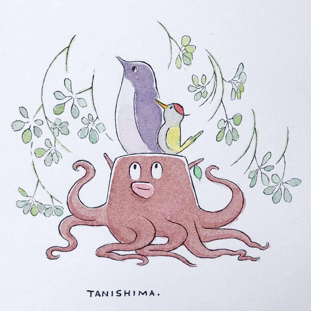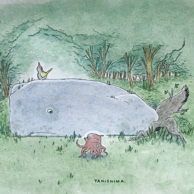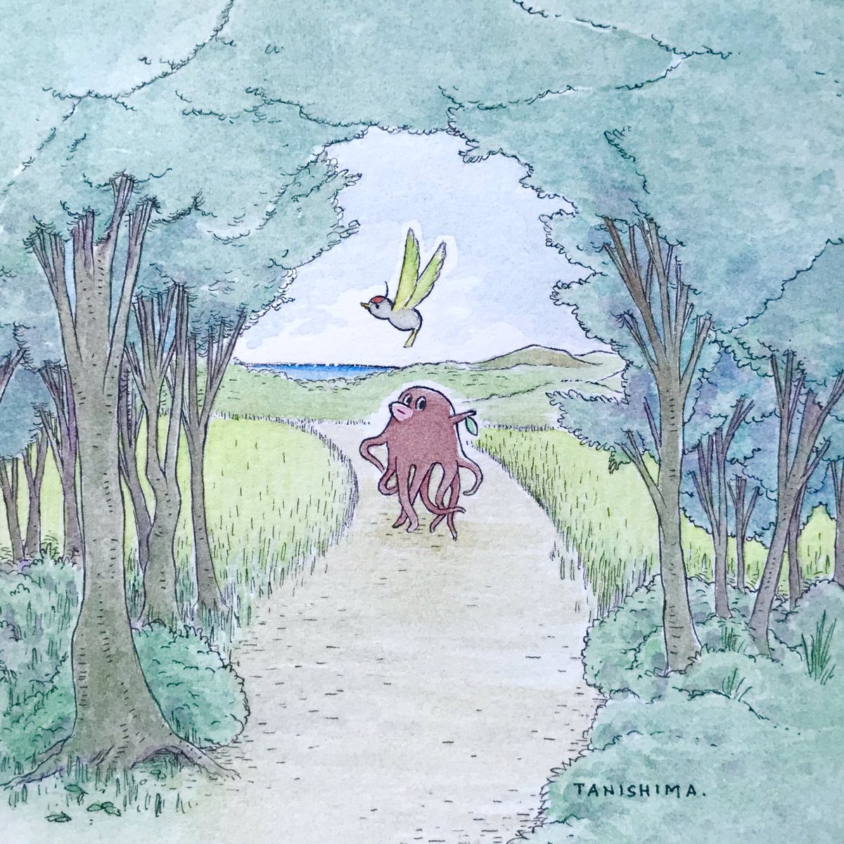 海に、行ってみるか!! 森よ、さようなら〜。 #カブタコ #切株 #旅立ち #海へ #kabutako #treestump #woodpecker #谷縞 #イラスト #アート #絵本 #水彩 #tanishima #drawing #illustration #art #sketchbook #picturebook #watercolor
