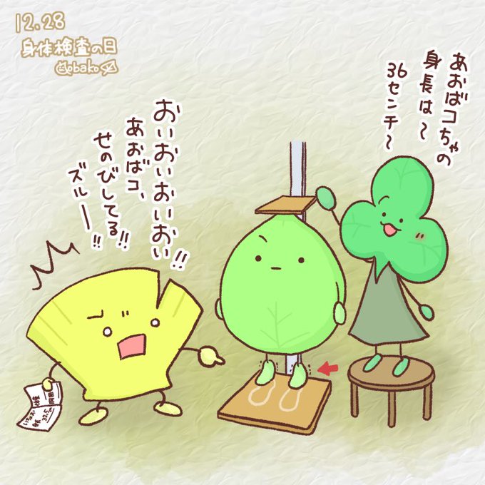 おはばコ~☀️ 今日は「#身体検査の日」だよ⚖️📐 まずは身長を測るよ!!! え?え?あおばコ、ズルなんてしてないよ?♪~(´ε` ;) #もともとあおばコのが背が高いし #いちょおのコンプレックス #今日は何の日 #12月28日 #一日一絵 #あおばコ #1コマ漫画 #1コマイラスト #みんなで楽しむTwitter展覧会