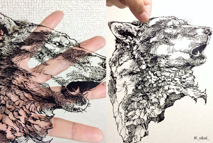 オオカミの切り絵 #過去作品あげて最近繋がった人びっくりさせよう大会 2016年くらいの作品なので当時画力が低いなどの指摘もあったのですが、個人的にはその時にしてはかっこよく描けて切り絵にもできたのでとても気に入ってます