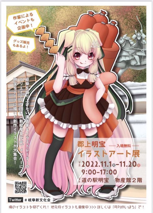 『郡上明宝イラストアート展』 開催期間:11月1日〜11月20日 イベント開催日:11月20日 場所:道の駅明宝 展示イラストは購入も可能✨ ⚠️明宝イラストのみ最終日にお渡し 画集、ポストカード、キーホルダーは一階売店にて販売! 缶バッチガチャもあるよ✌️ #郡上明宝イラストアート展 #道の駅明宝