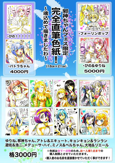 【邪フェス告知①】 ぴのサークル[30] 会場限定完全直筆色紙を出します!! 時間があればキャラ追加しますが、現在のラインナップはこちらが確定です! お一人様1点までとし、お好きなキャラを選択可能です。是非お求めください!作者の愛で溢れた色紙達です😊 #邪フェス #邪神ちゃんドロップキック
