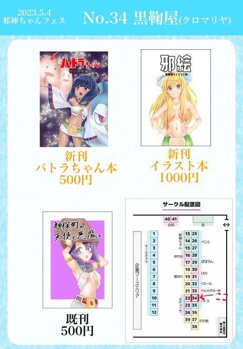 黒鞠屋の邪フェスお品書きです! 新刊はパトラちゃん本とイラスト本 既刊は去年の冬コミの本を持っていきますー また、いずれかを手に取っていただいた方に特典としてポストカード(パトラちゃん本表紙絵)をお渡しします 各詳細はツリーへ #邪神ちゃんドロップキック #jcdk #邪フェス