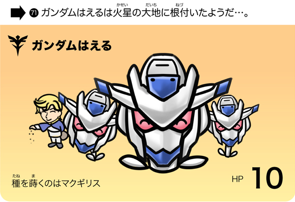 SDガンダムカードダス風カード本日2枚目! ガンダムバエルをモチーフにした 「ガンダムはえる」を描いてみました! 火星の大地に根付いた植物のようだけど…??? あ!あそこにいるのは種をマクギリス…!! #SDガンダム #鉄血のオルフェンズ