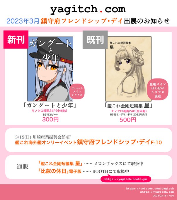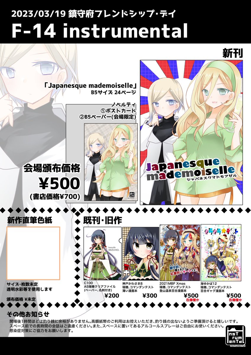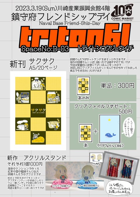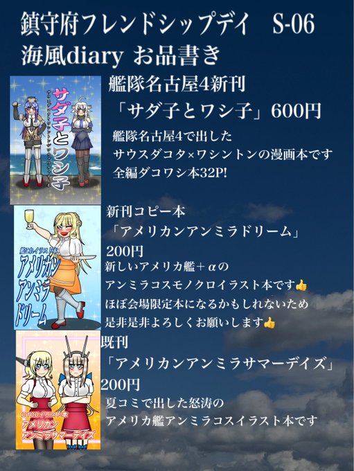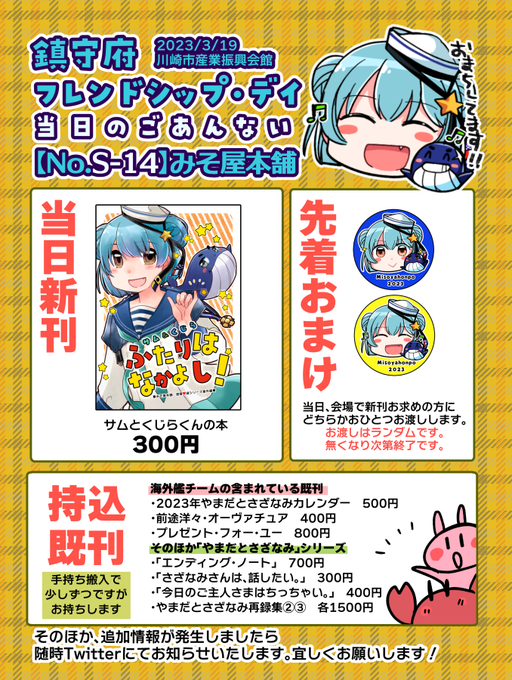 【🌸3/19 #鎮守府FSD 🐋おしながき】 S-14「みそ屋本舗」でお待ちしております!どうぞよろしくお願いいたします。これ以外で余力があればミニ色紙を描きたいと思ってます~ 🐋新刊サンプルtwitter.com/misonokan/stat… 📚持込既刊サンプルまとめ pixiv.net/user/14306/ser…