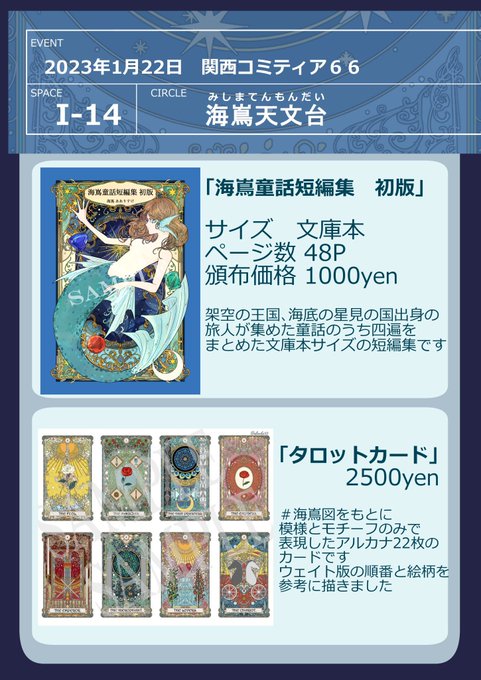 【お品書き】 2023/1/22開催の関西コミティア66にサークル参加します🌟 ◆サークル 海嶌天文台(ミシマテンモンダイ) ◆スペースI-14 写真の他に缶バッジやアクキー、シーリングスタンプなどもお持ちします お気軽にお立ち寄りください☺️ #関西コミティア66 #関西コミティア #お品書き