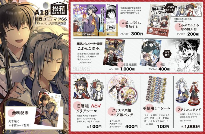 #関西コミティア66 お品書き 🗓1月22日(日) パルスプラザ京都(京都府) 🗓A18 松箱・暦の擬人化 既刊&グッズを持っていきます! お年賀カードも配布します。よろしくお願いいたします! 🛒通販 matsboxxx.booth.pm