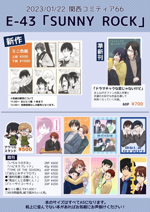 1月22日に京都パルスプラザで開催される #関西コミティア66 にサークル参加します! スペースNO:E-43 サークル名:SUNNY ROCK 新作はミニ色紙になります。間に合えばペーパーもあるかもです! 関西は初参加になりますので覗きに来てもらえると嬉しいですっ!! #関コミ #創作BL
