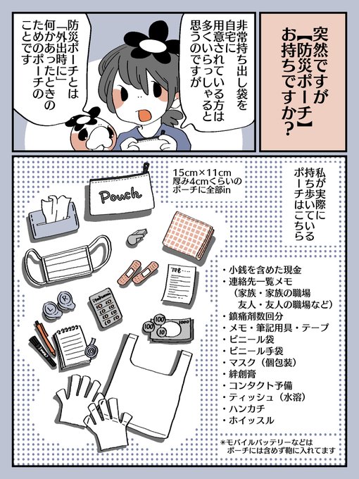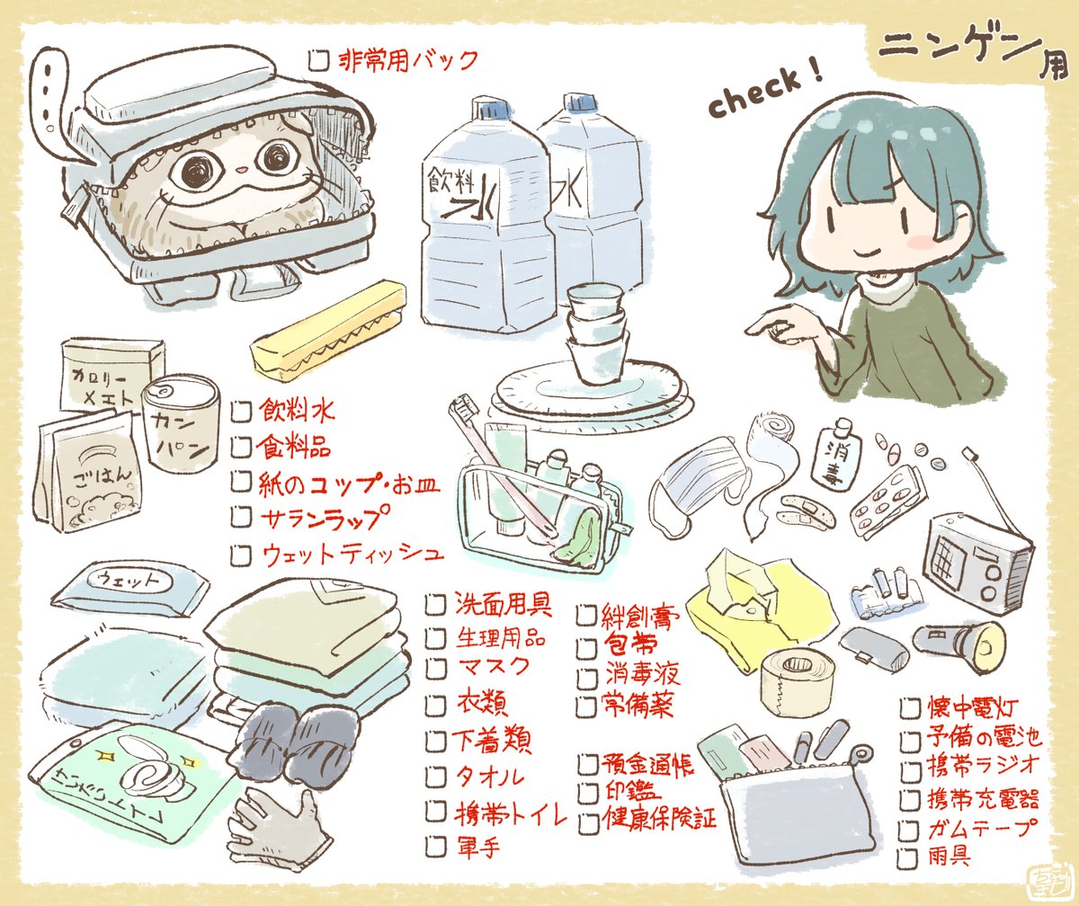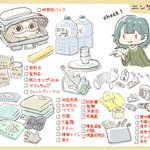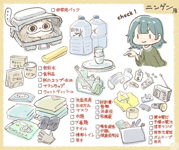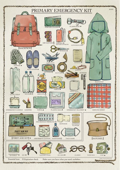 『飾れる防災』つくりました。 普段から飾っておける冒険道具の標本のような非常一次持ち出し袋のポスターです。★は必須品、🕑時計マークは期限のあるもので、使用可能かのチェックに。SUZURIさんで簡単に貼って剥がせる防水吸着ポスター各種販売中です。 suzuri.jp/watanabe_harun… #防災の日