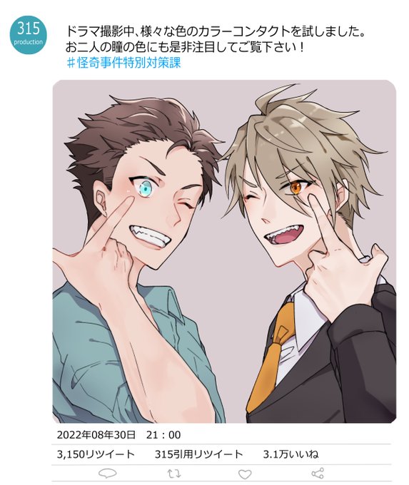 #龍握ワンドロワンライ お題「瞳」 一時間を超超超オーバーしました。 ドラマ名とかは適当に考えたので無いです。多分超能力有りの不思議事件を解決するドラマ。 瞳の色交換はあるけど瞳の塗りまで交換するのは個人的になかったので塗ってて楽しかったです。