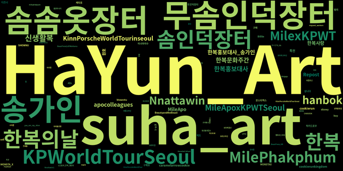 📌 2022년 10월 18일 한복 관련 해시테그 트렌드 입니다. 🏆 한복 해시테그 단어 랭킹: 🥇 #HaYun_Art - 435회 🥈 #무솜인덕장터 - 108회 🥉 #송가인 - 107회 트윗 1500개로 분석된 결과입니다.