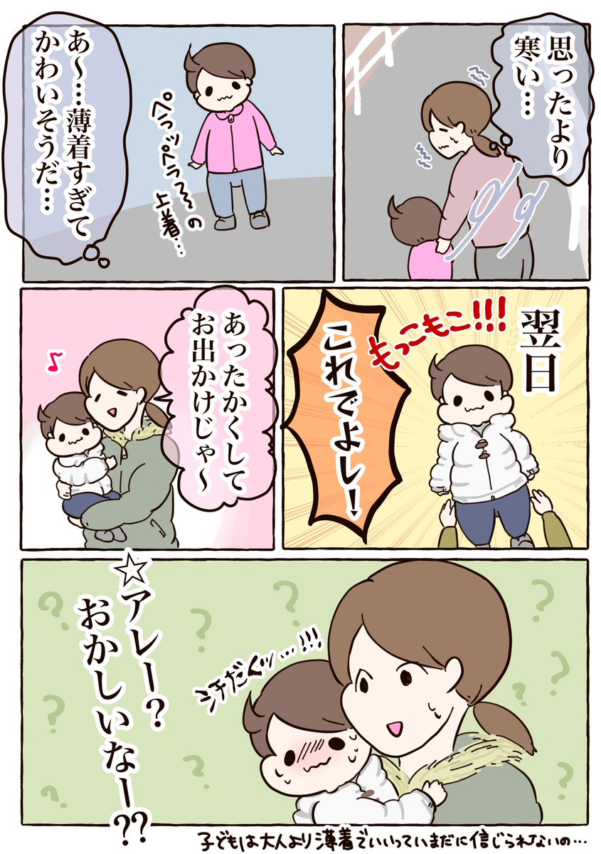 私には着せすぎる気がある…😌 だって!なんか!寒そうじゃん!!! 外出中の子どものちょうどいいがわからんのよ〜😭 1枚少なく着せてとか聞くけど寒いよ… あったか肌着系ってかゆくなんない? 乾燥すすまない?? たぶん私一生心配するわ🙄 #育児漫画 #1歳9ヶ月 #漫画が読めるハッシュタグ
