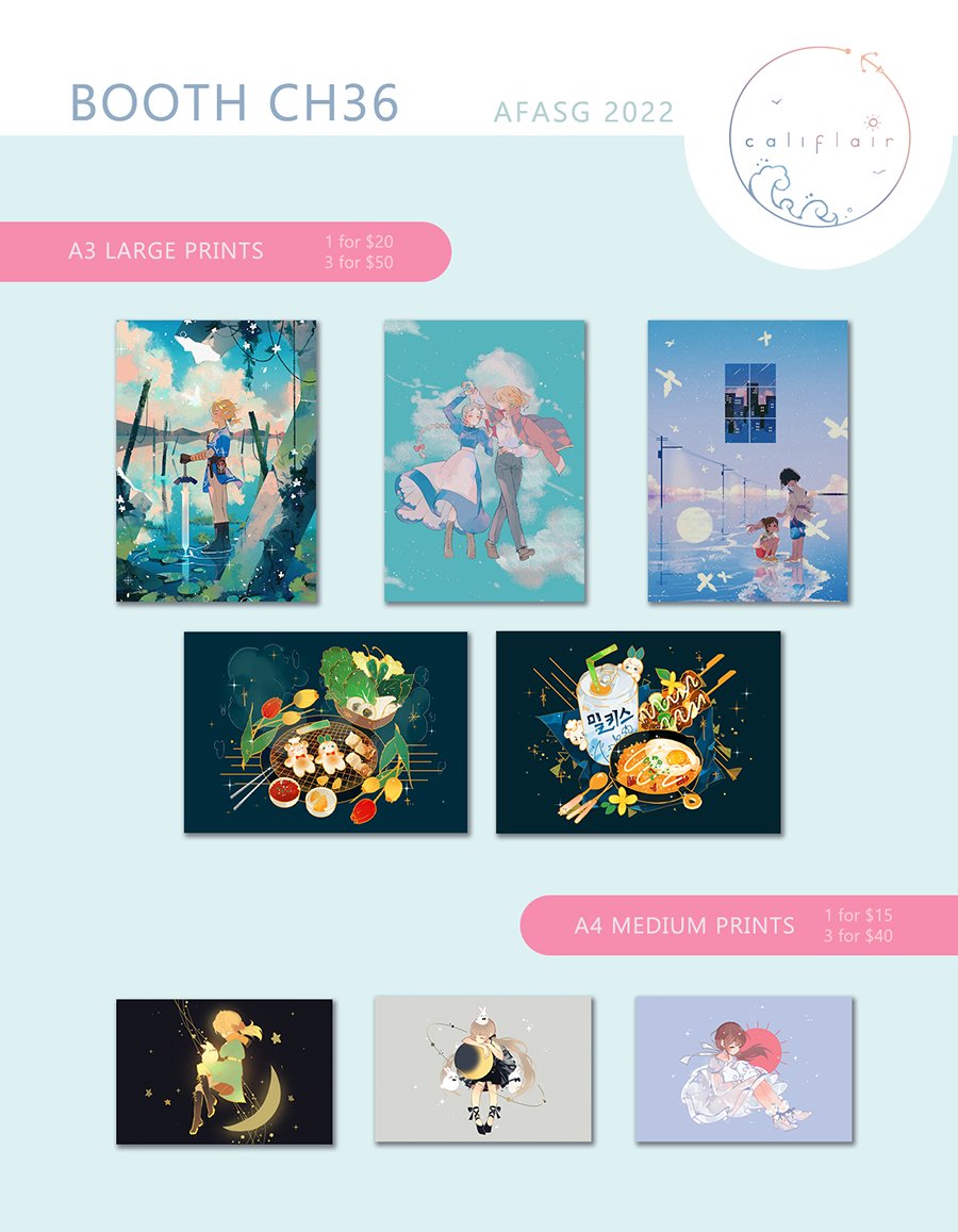 My catalogue for AFASG this weekend! Super nervous but also very excited to table at sg again 😭💖 Hoping to see you there! I'll be at CH43-44 with @munette and @emeldraws 🎉 1/2 #AFASG2022 #AFASG22
