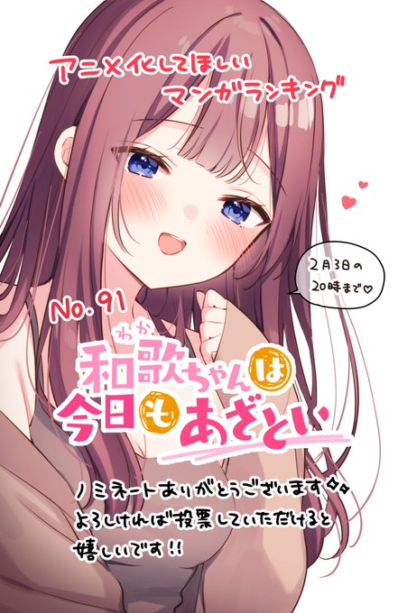 【 #和歌ちゃんは今日もあざとい 】 第6回アニメ化してほしいマンガランキングにノミネートしていただきました!🙇♀️ 👇よろしければ投票していただけると嬉しいです! onl.la/QhwiMfU #AJ2023 #AnimeJapan #アニラン