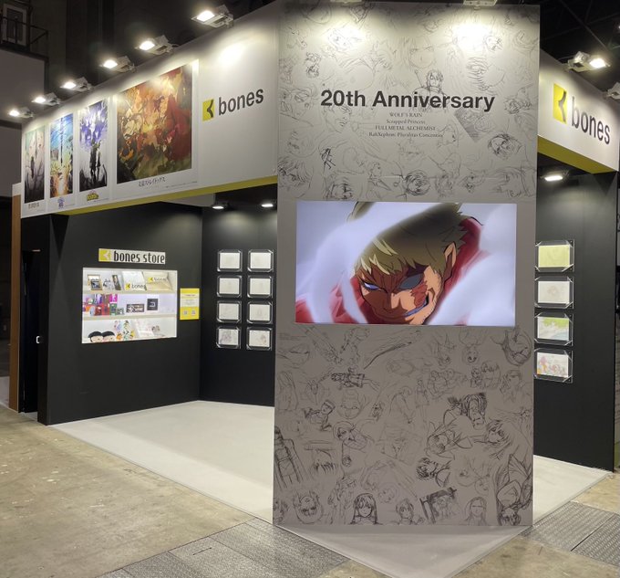 明日からの #AnimeJapan のボンズブースですよ。 モニターの周りは、今年20周年の 「WOLF'S RAIN」 「スクラップド・プリンセス」 「鋼の錬金術師」 「ラーゼフォン 多元変奏曲」 の、4作品の総作監修正がプリントされておるよ。 #アニメジャパン2023 #AJ2023