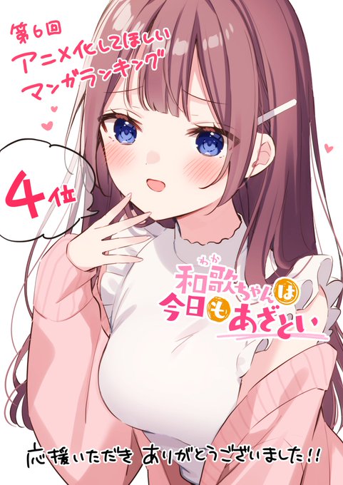 『#和歌ちゃんは今日もあざとい』 第6回アニメ化してほしいマンガランキングにて4位をいただきました!応援してくださった皆様、本当にありがとうございます…!!🙏✨ #AJ2023 twitter.com/animejapan_aj/…