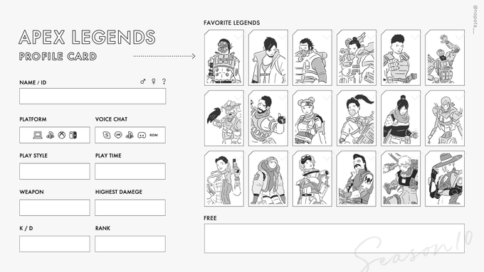 . 🚀 #Apex自己紹介カード 🚀 🔫シーズン7対応🔫 ◆オリジナルカラー ◆ボカシフィルター 💘自由に使ってください💘 #Apex自己紹介カードテンプレ #ApexLegends #Apex募集pc #APEXフレンド募集 #APEX男子 #APEX女子 #apex #ホライゾン #ドット絵 #フリー素材