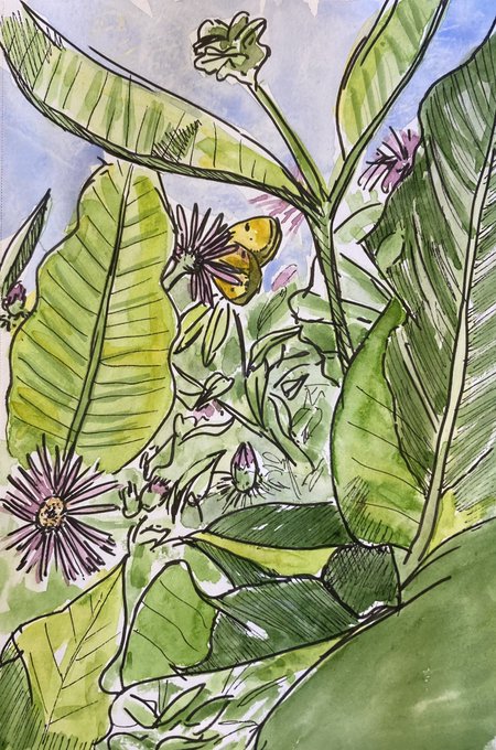 A beautiful Little Yellow Butterfly as summer comes to a close. #art #ink #watercolor #butterfly #aster #garden #StatenIsland
