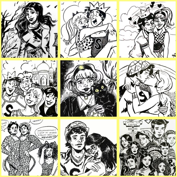 Hello and Happy day 21 of #blacktober and have a strawberry milkshake on Archie and the gang. Pop definitely has enough straws to pass around. #drink #milkshake #archieandrews #veronicalodge #bettycooper #archiecomics #art #illustration #blacktober2022 #day21