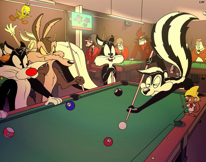 Noche de billar. Los Looney Tunes se divierten en un pequeño bar jugando al billar durante la noche, incluyendo también los cancélators para despejarse de sus labores en la cultura de la cancelación. 🎱 #LooneyTunes #cancelators #night #bar #billar #fanart #playing