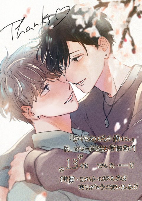 #BLアワード2022 にて官能部門13位いただきました!投票・コメントいただいた方々ありがとうございました…!#かりそめビッチ南くん つづきの話のコミックスも今年の秋頃には出るかな?と思うので引き続き宜しくお願いします🙇♀️