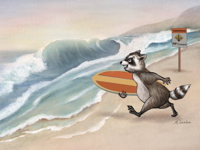 Day 23-RIP! Raccoon was in a hurry to hit the waves! #Inktober #inktober2020 #Inktoberrip #rip #ripcurrent #colour_collective #BLACKIRIS #raccoon #surfing #illustration #drawing #sketching #painting #raccoons #ChildrensBooks #art #drawtober #drawtober2020 #kidlitart #HappyFriday